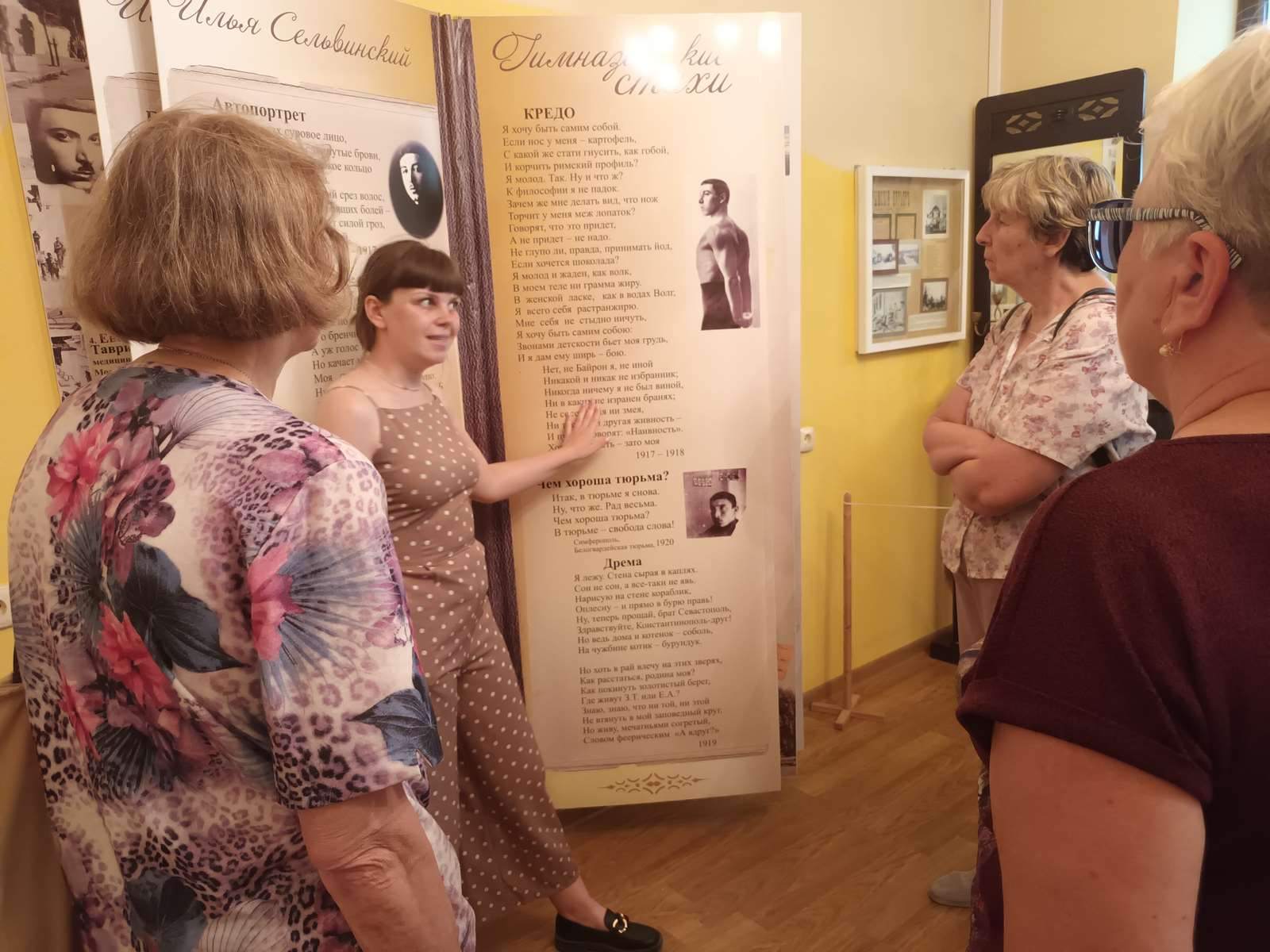Анна рассказала, о том, что экспозиция, посвященная выдающемуся крымчанину, поэту Илье Сельвинскому (1899–1968), была создана в 1990 году как временный выставочный вариант. В основе экспозиции материалы, подаренные падчерицей Цецилией Воскресенской и дочерью поэта. Музей расположился в переулке Бондарном, в котором в 1899 году родился и до 1905 года жил поэт Илья Сельвинский. На здании была установлена мемориальная доска. Открытие Дома-музея было приурочено к 110-летию со дня рождения писателя.