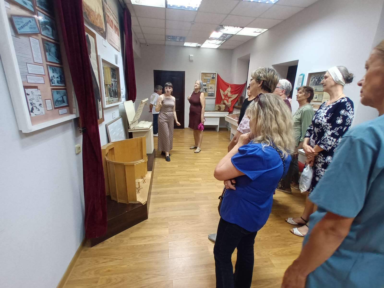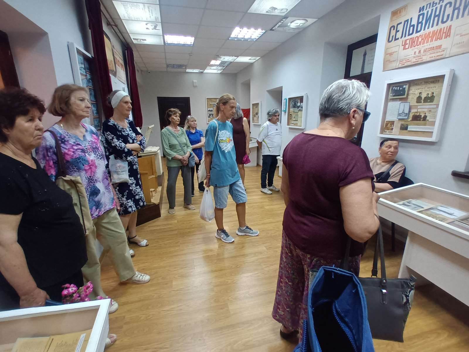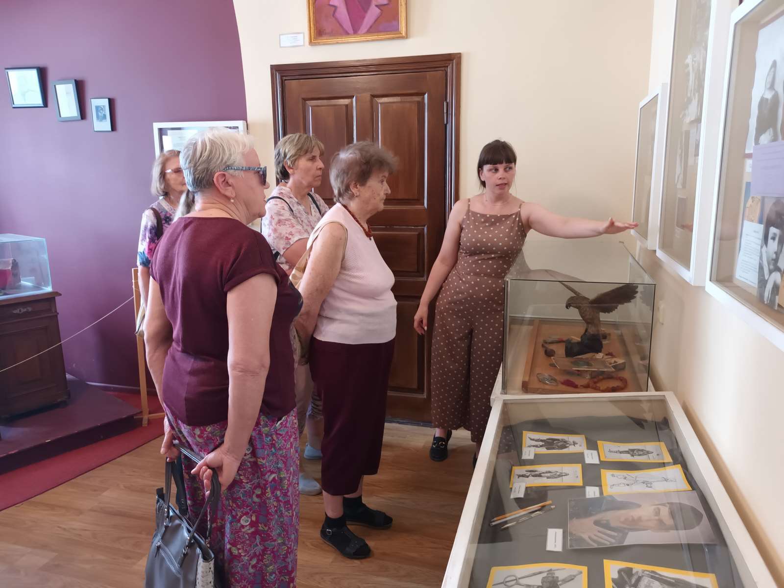 При посещении первого этажа музея пожилые люди увидели картины театрального художника и живописца Татьяны Сельвинской – дочери поэта, а также черно-белые рисунки художников Валерия Гаевского, Анны Тынчеровой, Сергея Савинова под общим названием «Рисующие поэты».