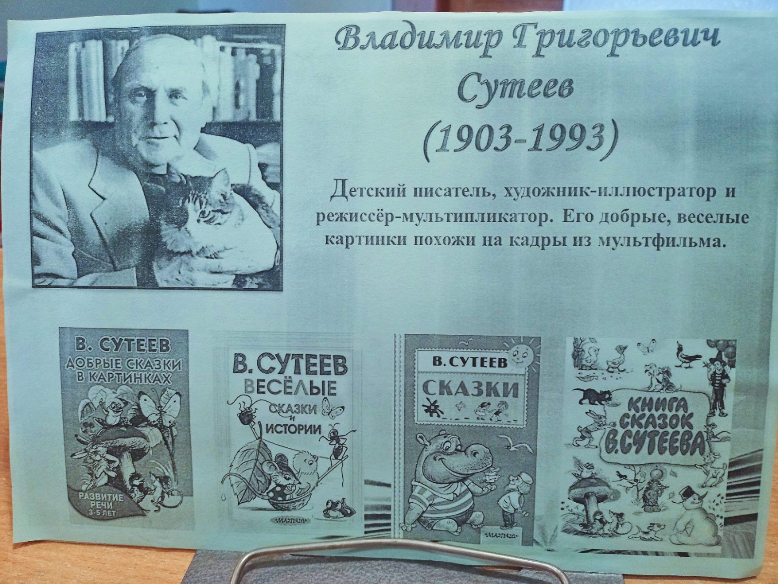 10 июля 2023г. в социально-реабилитационном отделении для детей и подростков с ограниченными возможностями для получателей социальных услуг заведующей детской библиотекой-филиалом №8 Галиной Рябко была организована литературная гостиная «Путешествие по сказкам В.Г. Сутеева», приуроченная к юбилейной дате — 120 лет со дня рождения замечательного детского писателя, художника-иллюстратора, режиссера-мультипликатора Владимира Григорьевича Сутеева.