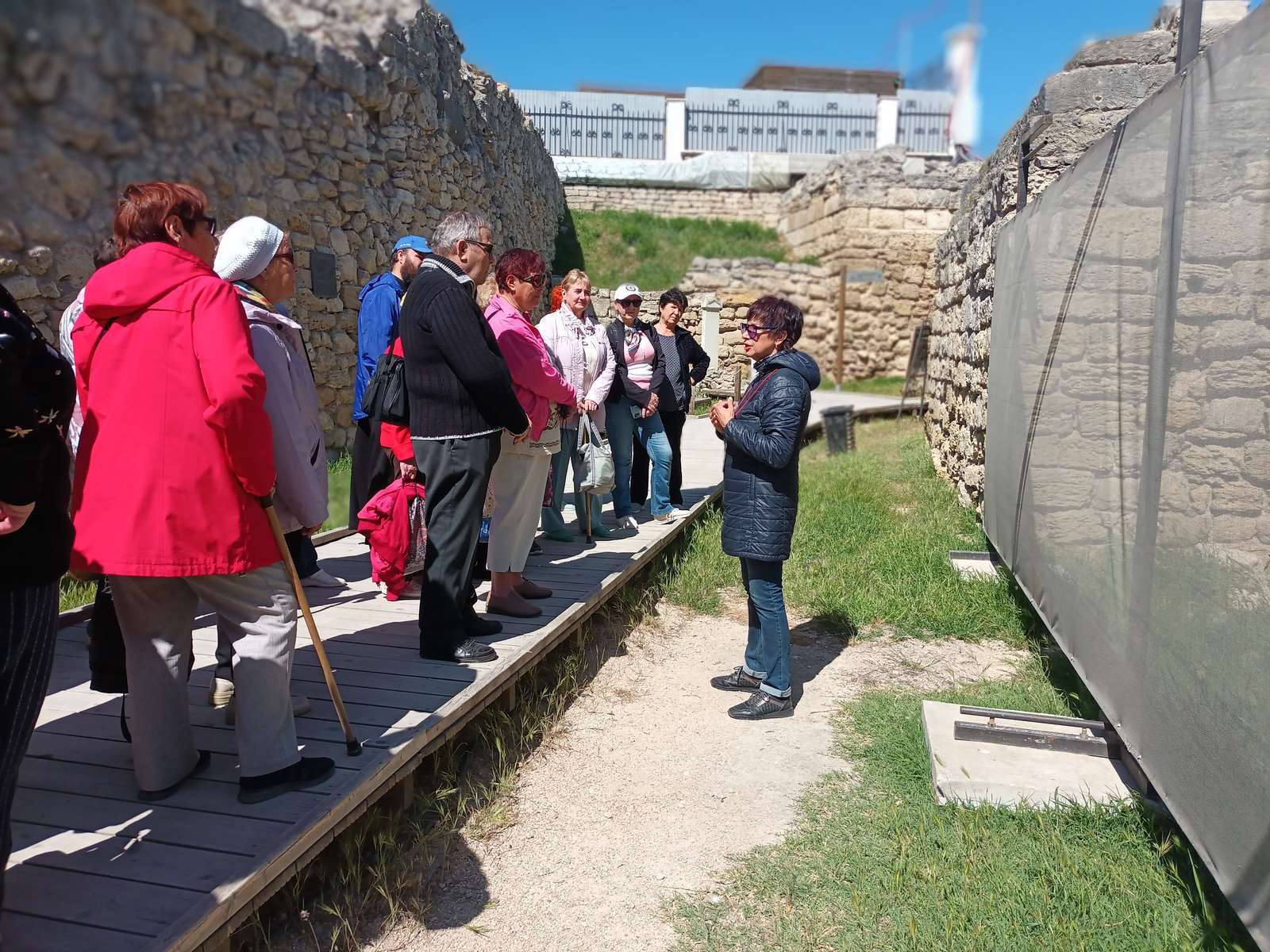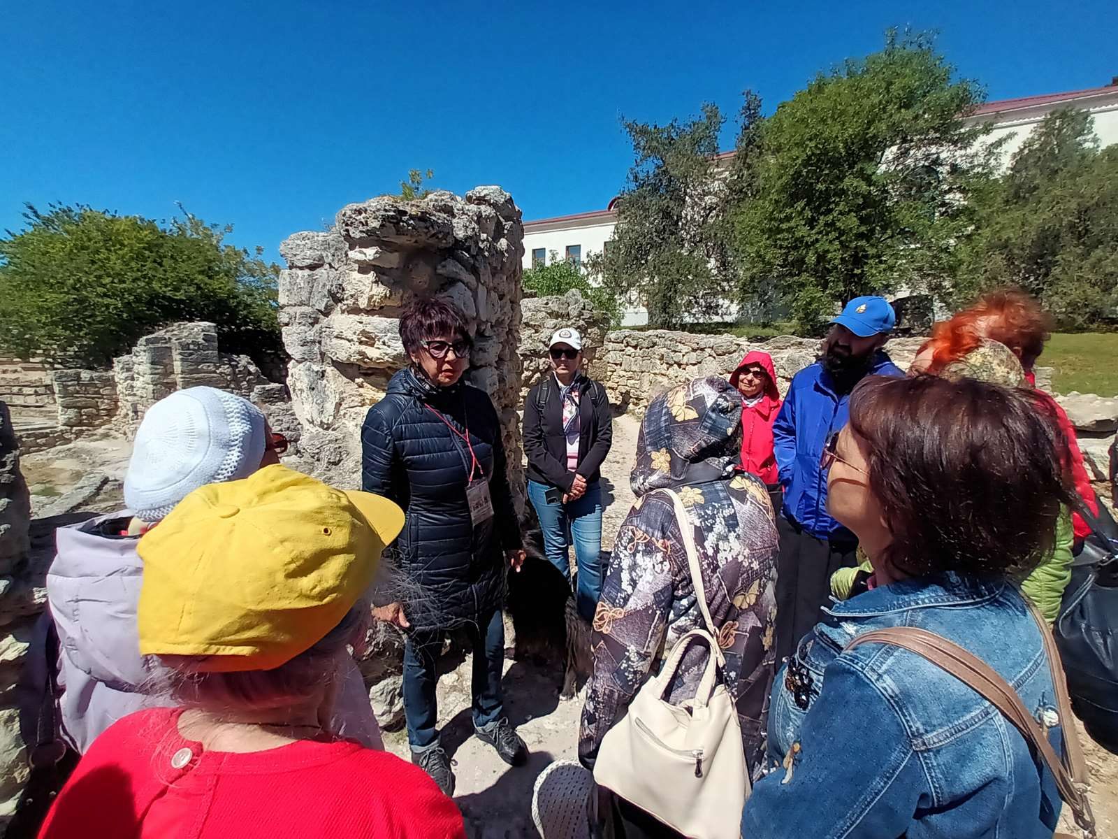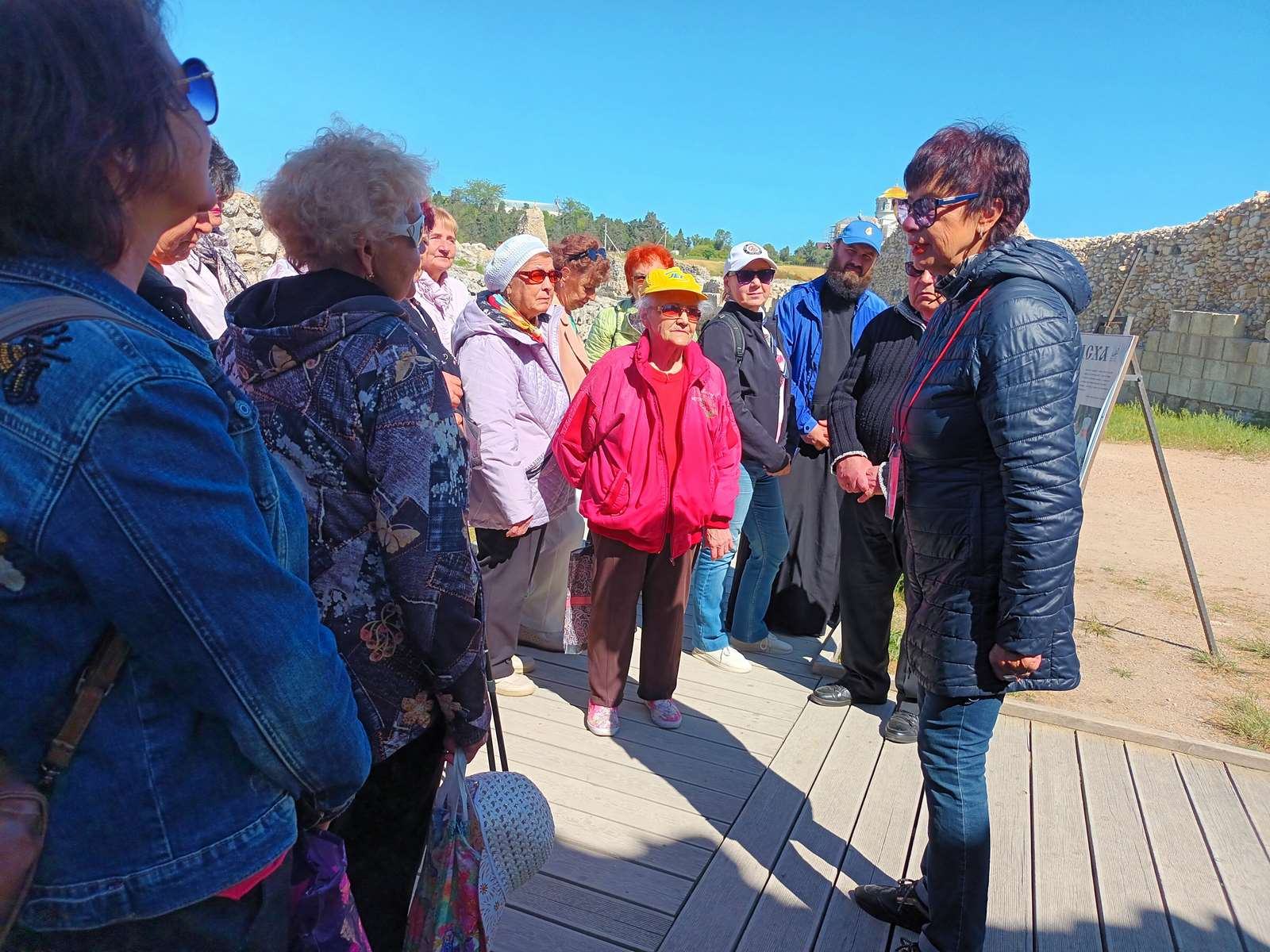 Экскурсовод – Аверина Ирина Геннадьевна сразу же погрузила экскурсантов в мир истории.  Чем знаменит Херсонес? Ведь это не просто древние развалины – город когда-то наполнял гул человеческих голосов, призывы купцов-зазывал и даже дикие окрики гладиаторов. Херсонес Таврический был заложен древними греками в IV веке на Гераклейском полуострове на юго-западном побережье Крыма. Ныне Херсонесское городище расположено на территории Гагаринского района Севастополя. На протяжении двух тысяч лет Херсонес был политическим, экономическим и культурным центром Северного Причерноморья. Ирина Геннадьевна рассказала пожилым людям о достопримечательности Херсонеса — башне Зенона. Судя по надписи на мраморной плите, украшающей одну из стен сооружения, имя объекта было дано в честь византийского императора Зенона, поскольку он неоднократно выделял средства на реконструкцию башни. Хотя  башне приходилось принимать на себя множество вражеских ударов, но она сохранилась наиболее полно среди остальных объектов города.