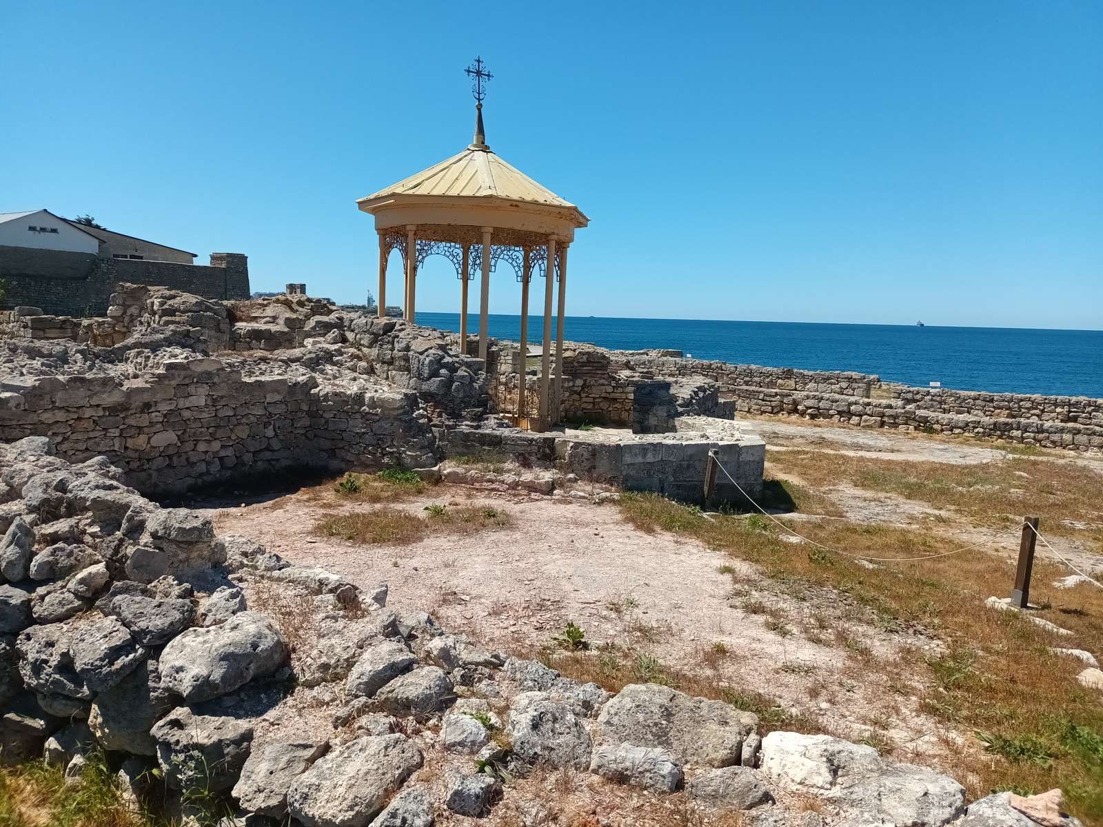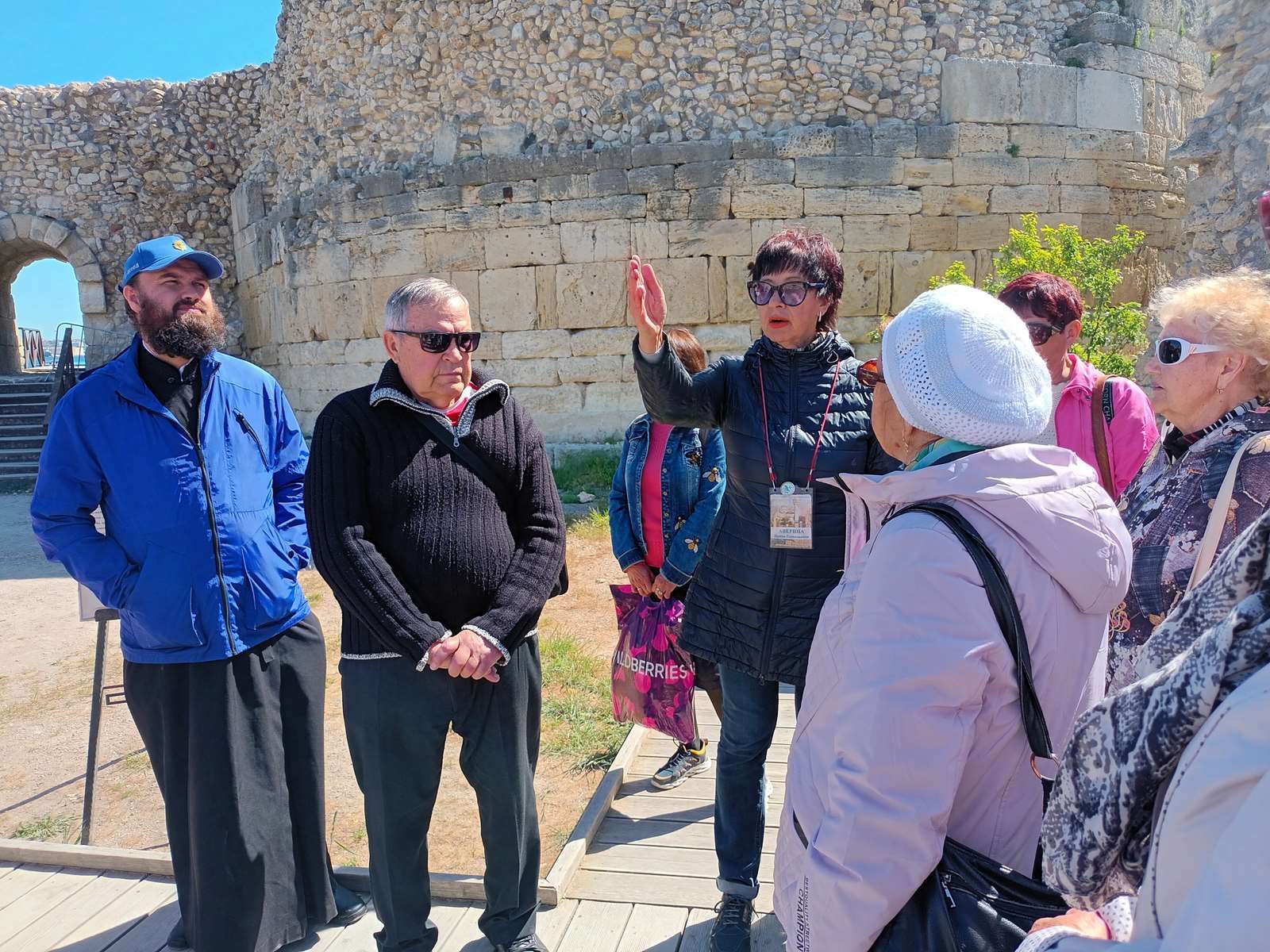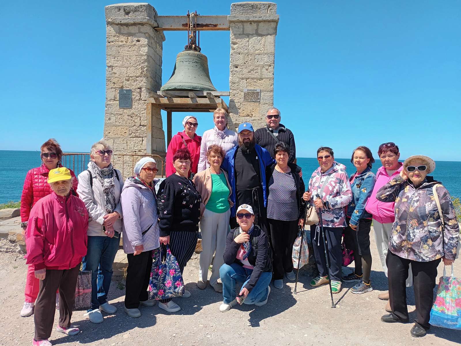 Далее экскурсию продолжил священнослужитель Александр, который показал пожилым людям Владимирский собор, построенный в неовизантийском стиле во второй половине XIX века, а также ещё одну достопримечательность – Туманный колокол, являющийся одним из наиболее знаковых памяток города-крепости, установленный неподалёку от комплекса античных терм в 1925 году. До того, как корабли стали использовать эхолокацию, он служил звуковым маяком в туманные дни.