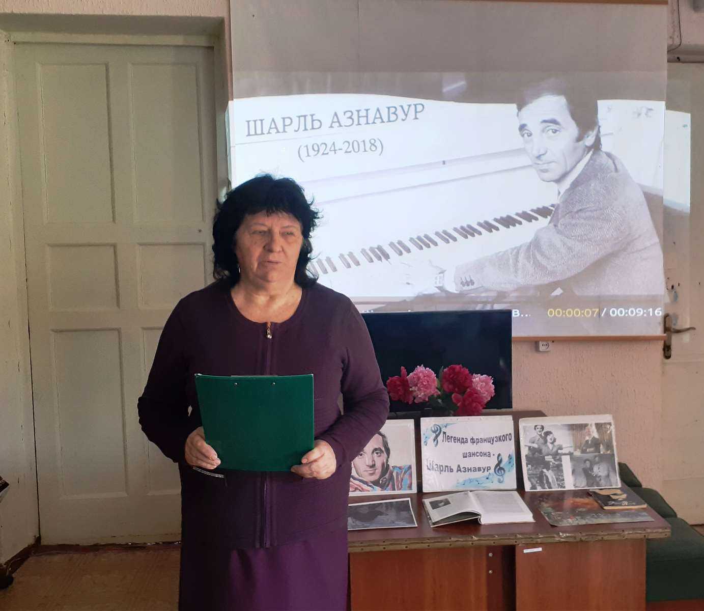 Библиотекарь Любовь Соловей рассказала слушателям о том, что Шарль  Азнавур  был успешным актером и режиссером мюзиклов, а в 1991 году получил признание и как писатель.
