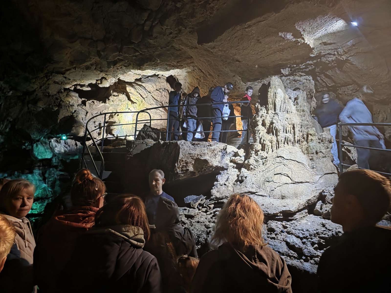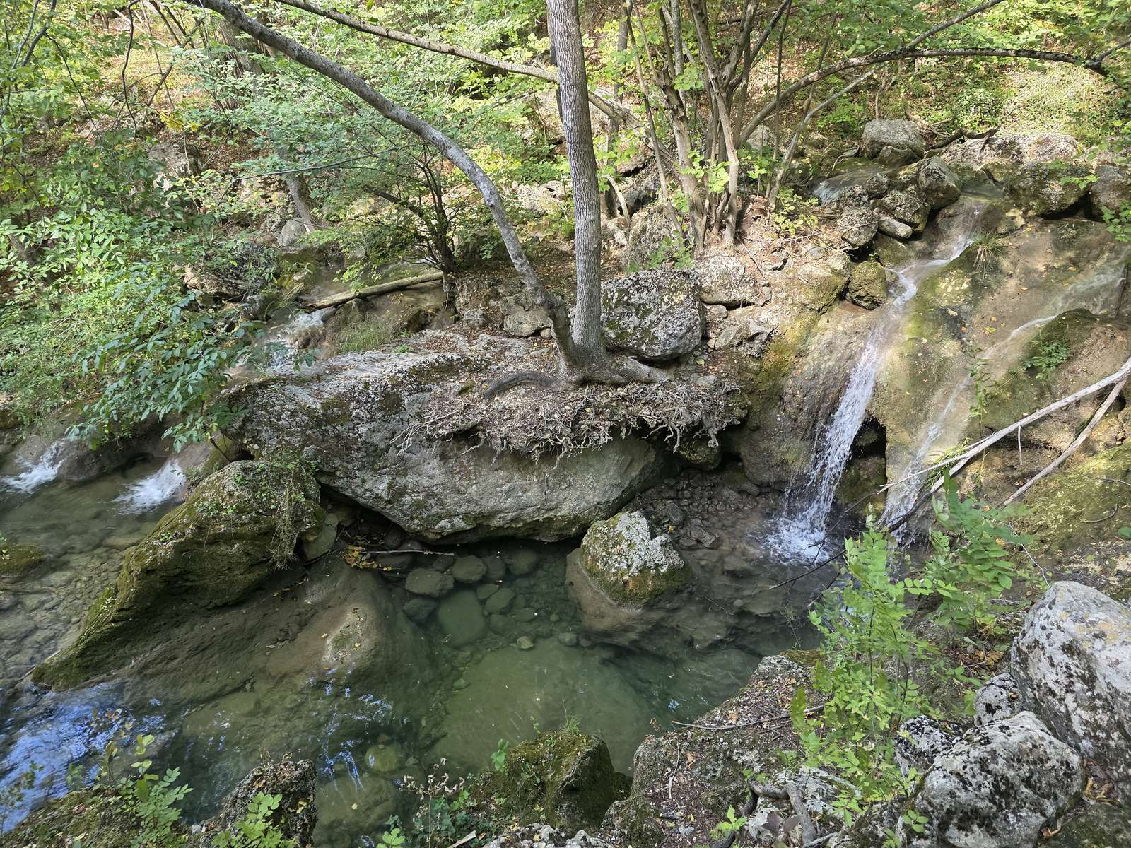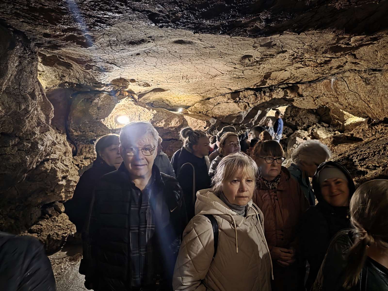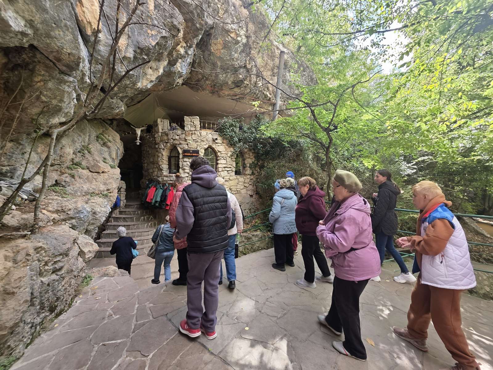 Осенний лес в урочище порадовал путешественников своей свежестью и насыщенными красками. Одним из самых впечатляющих моментов поездки стало посещение Красных пещер. Шум горной реки, чистый прохладный воздух, а также тропы, оборудованные лестницами, перилами и помостами, сделали приятным пеший подъем. Многие оказались в пещерах впервые и были поражены величием и красотой этого нерукотворного памятника природы. Грандиозные залы (Индийский, Китайский, Академический) достигают 30-40 метров высоты. Подземные галереи украшены разноцветными ажурными натёчными образованиями, множеством сталагмитов, сталактитов, колонн и драпировок. Подключив воображение, в причудливых камнях можно было рассмотреть Подземного Хозяина, Гнома, Птеродактиля, Пизанскую башню, Зайца и даже Деда Мороза. Там же есть озера, найдены костные останки пещерных медведей и материальные следы людей кизилкобинской культуры. Главная достопримечательность пещеры – подземная река Су-Учхан, хрустальными водами которой можно любоваться бесконечно долго. При выходе из пещеры река образует красивый водопад с одноименным названием и ниже каскад порогов.