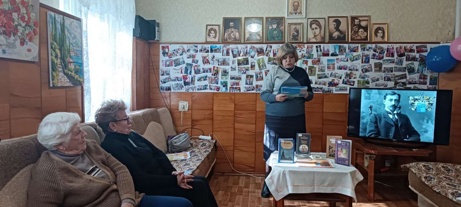 К 155-летию со дня рождения великого русского поэта, писателя, переводчика И. А. Бунина сотрудником городской библиотеки-филиала № 13 им. С. П. Щипачева для получателей социальных услуг социально-реабилитационного отделения граждан пожилого возраста и инвалидов № 2 (ул.Гайдара,4а) была подготовлена литературная гостиная «И след мой в мире есть…».