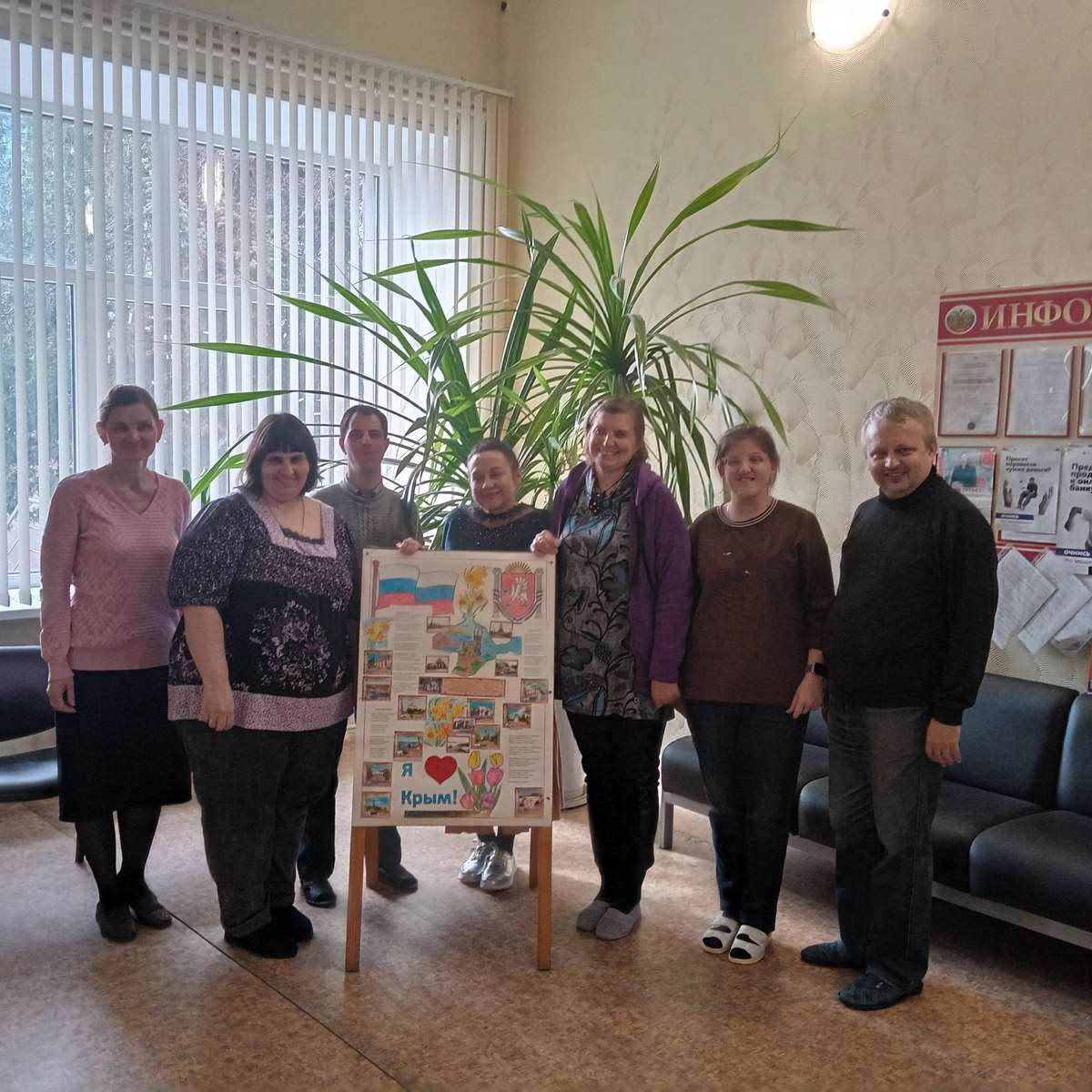 В отделении было организовано и успешно проведено множество мероприятий, посвященных важному событию – воссоединению Крыма с Россией. В рамках одного из таких мероприятий, в знак поздравления для присутствующих, получатели социальных услуг, под чутким руководством инструктора по труду Шарох Е.Н., создали яркий и символичный плакат. Эта творческая инициатива, зародившаяся в предвкушении праздника, стала прекрасным поводом для объединения молодых и талантливых людей, подарив им радость совместного творчества и новые горизонты для самовыражения.